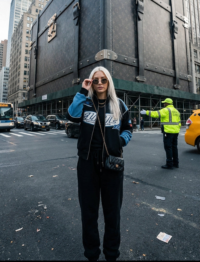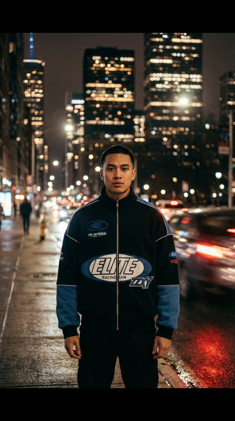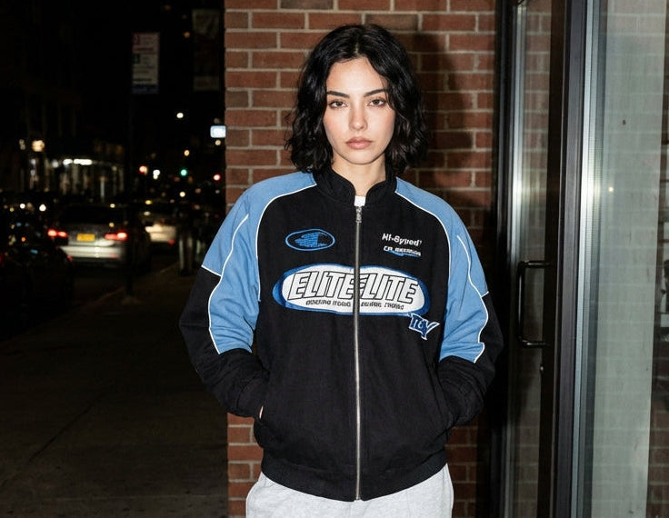 Introducing the Biker-Racing Jacket. This jacket has an oversized fit, with screen printed artwork to the front & back. It has puffer lining, stand collar and ribbed sleeves and hem.