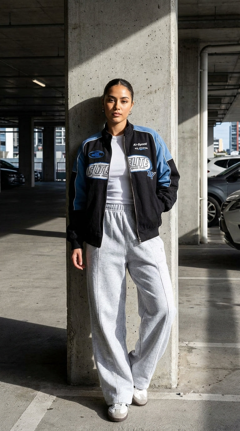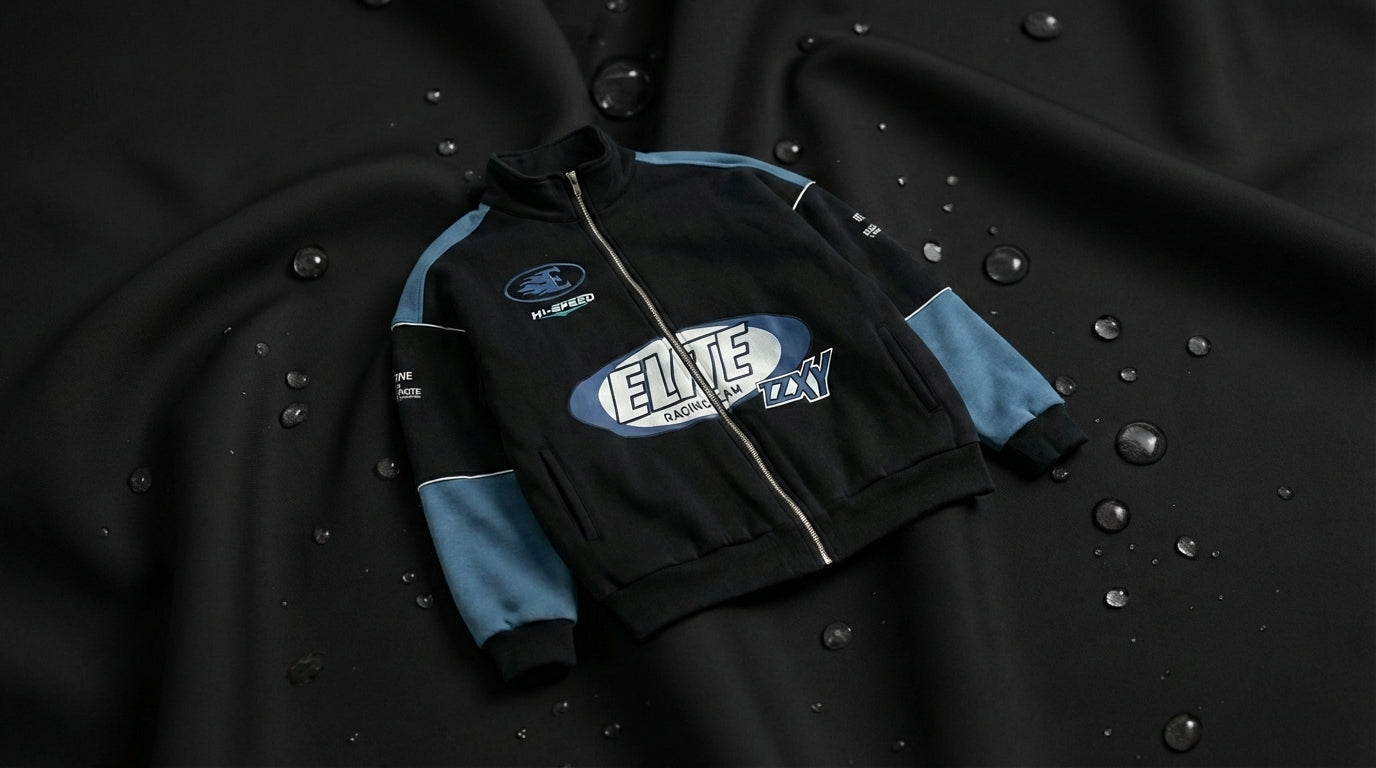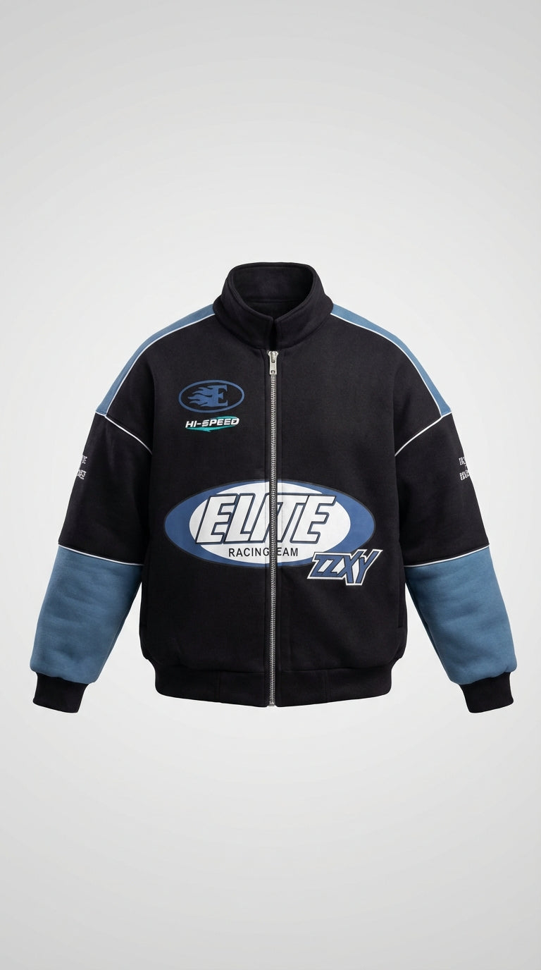 Introducing the Biker-Racing Jacket. This jacket has an oversized fit, with screen printed artwork to the front & back. It has puffer lining, stand collar and ribbed sleeves and hem.